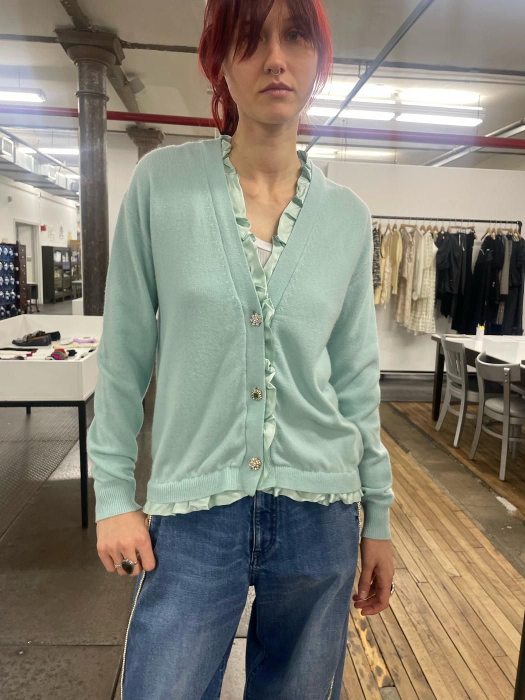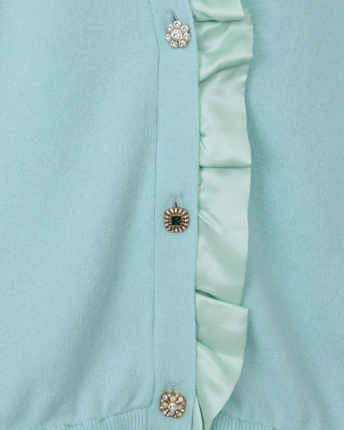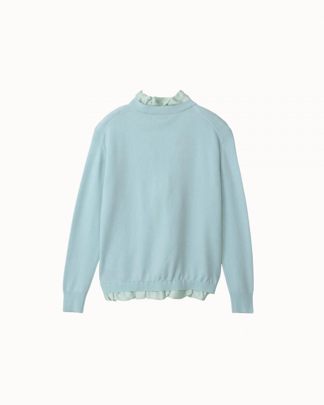首元にはシルクサテンのフリルをあしらい、肌あたりの良さに加え、ビジューのボタンが華やかで上品な印象に。程よくゆとりのあるサイズ感です。